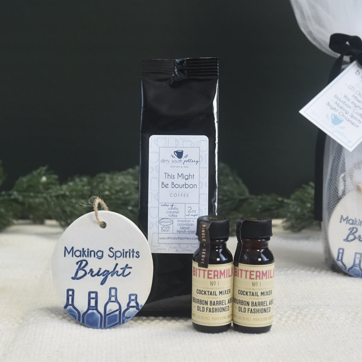 If you’re looking for a small gift for a bourbon drinker in your life, your search has come to an end. This gift set was curated to include something to add to their favorite bourbon (2 Old Fashion Mixers), something inspired by their favorite spirit (‘This Might Be Bourbon’ Coffee Blend) and something to bring in the holiday joy (Making Spirits Bright Ornament).