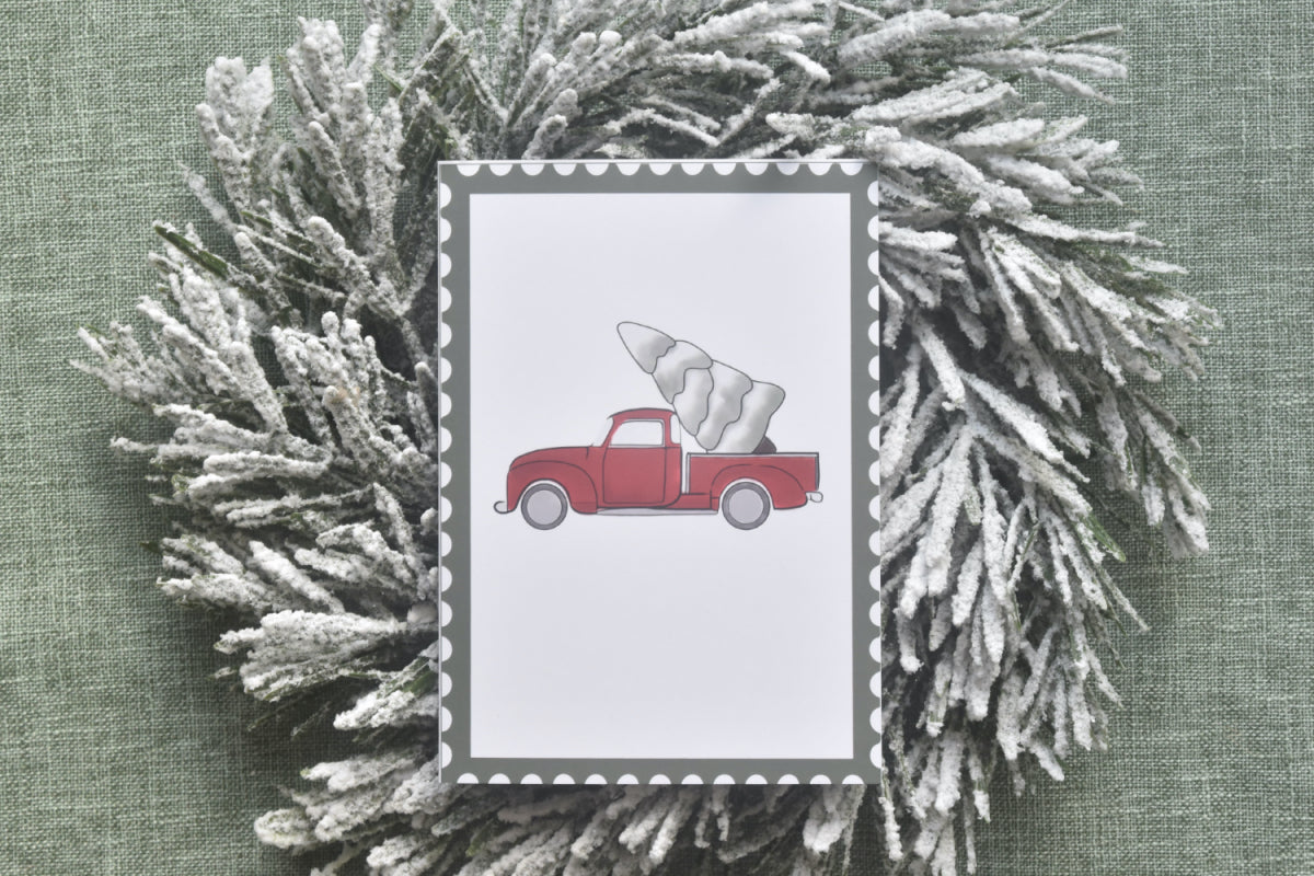 These four designs are a part of our Green Series, with each design finished off with a green border. Choose to buy individually, or one of each in our Set of Four. Designs include: Wreath, Truck, Snow globe, & Sleigh.